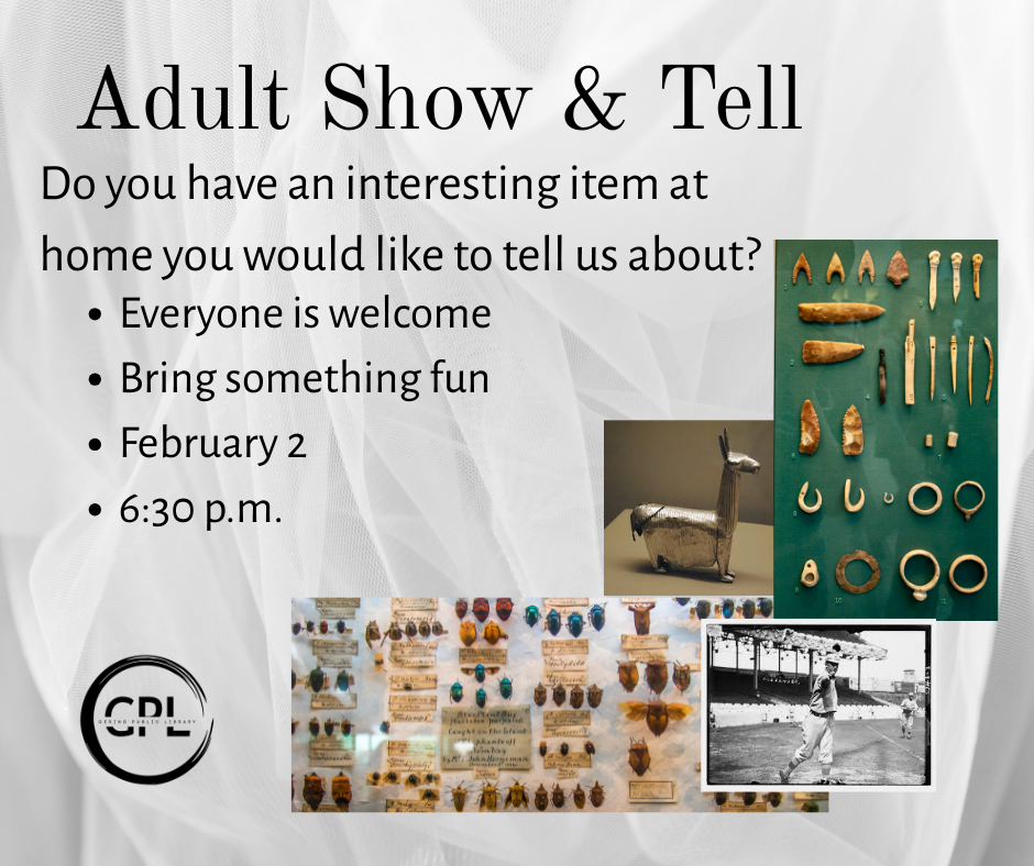 Bring an interesting item to the library and share about it with others. Everyone is welcome. Adult Show & Tell will take place on Monday, February 2nd, at 6:30pm in the Community Room. |